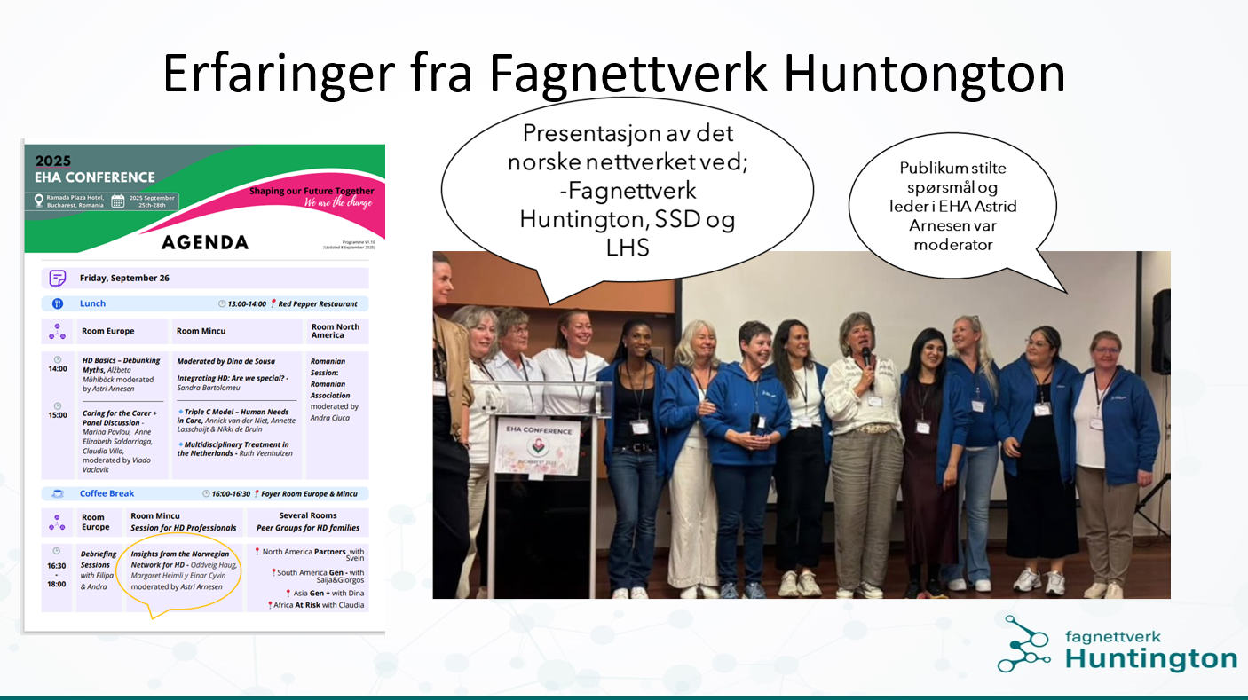 Delegasjonen fra Fagnettverk Huntington fikk også vist seg på scenen; vi beskrev hvordan veien frem til hvor vi står i dag har vært og delte av våre erfaringer med å ha tilbud ut i kommunene rundt om i hele landet.